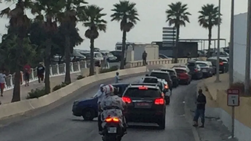 Este tránsito de coches y pasajeros también se está notando en las inmediaciones de la frontera que, aunque no hay porteo estos días, se están formando colas como la que se aprecia en la imagen, en la carretera N-352, que llegan hasta la playa de El Chorrillo.