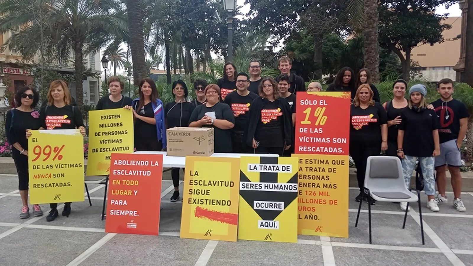 Una caminata silenciosa en disposición de fila india se dirigió en la mañana del sábado desde la Plaza de África hasta la Plaza de los Reyes. Se trataba de una colaboración con la organización A21 que lucha contra las diversas formas de esclavitud presentes en el mundo, entre ellas la esclavitud de índole sexual, los niños esclavos que en continentes como África o India trabajan incluso para grandes multinacionales en condiciones infames, tráfico de órganos, los niños soldados reclutados en guerras olvidadas de países en vías de desarrollo, los esclavos de la asociación terrorista ISIS o los trabajadores forzosos no remunerados.