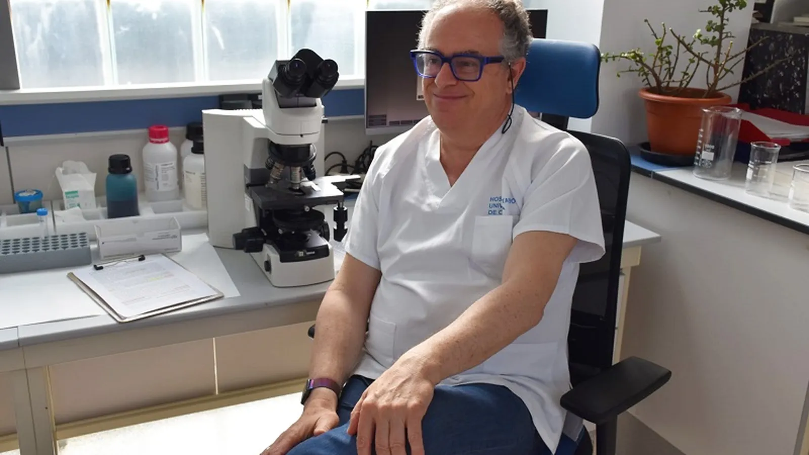 “Uno está en un hospital pequeño. Imagínate, hay 700 hospitales en España, con 700 jefes, 700 tutores de formación. En fin… Que el 19 de mayo, el día de mi cumpleaños, me escribieron con el nombramiento”, resume Jacobo Díaz sentado de piernas cruzadas en una de las mesas que componen el mobiliario del pulcro laboratorio del HUCE, en la tercera planta de Consultas Externas. Frente a la puerta principal de la estancia, la pared luce atestada de dibujos de enfermeras, médicos, auxiliares y hasta personal de limpieza. Todos los trabajadores del servicio representados en el colorido mural. “Hay buen ambiente”, resumió Díaz al contemplarlo. Lo dijo con una sonrisa en el rostro, marca de la casa del doctor que, con unas gafas de pasta azules a juego con la inscripción del HUCE de su chaleco blanco, recibió este viernes a El Pueblo de Ceuta para hablar de su reciente nombramiento y de los retos asumidos en sus más de treinta años de profesión que le han valido ahora un hueco en un reducido equipo de expertos comandados por el Ministerio de Sanidad.