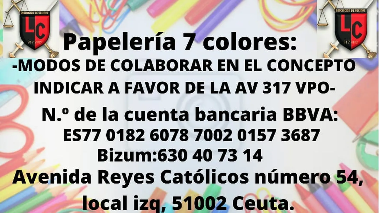 Para colaborar, ponen a disposición de los ceutíes el número de teléfono: 6060711584 y el email: aavv317vpo@gmail.com. Además, recuerdan que la Papelería 7 colores está situada en la Avenida Reyes Católicos, 54, 51002.