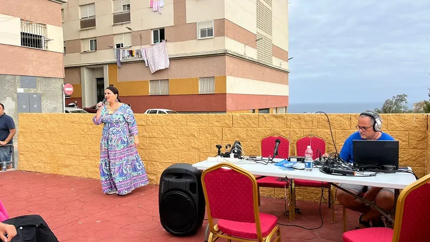 La voluntaria en la radio comunitaria, María Fernanda León, presentaba la jornada mientras se ultimaba el sonido. Fue Grigri Projects, la asociación intercultural, quien realizó el contacto Valencia-Ceuta. Según León, “vinimos a Ceuta para conocer desde cerca cómo viven los migrantes, cómo es su llegada y la hospitalidad que reciben”. En Radiorriols tienen un remedio en el que proporcionan clases de castellano a las personas que migran, además de un huerto comunitario.
